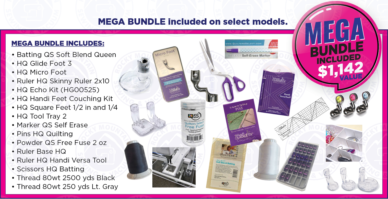 A 7-inch color touch screen puts all the controls at your fingertips. Why even the hand-wheel is on the screen! The machine comes with the ruler and open toe foot, but is compatible with all Handi Feet®. Fill the large-capacity M-class bobbin, choose any one of the five built-in tie-off stitches, and you are ready to quilt. If using a pattern, a pinpoint needle laser will guide you.