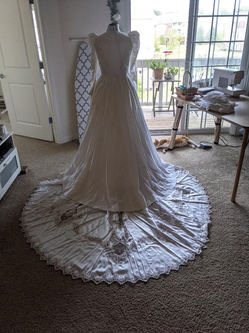 I did not really like how the train bunched up very quickly when I moved around. I wasn’t exactly sure if it was the fabric of the mockup causing this or if I was going to need to adjust the pattern and make the train longer. My Mom gave me her dress at the start of my dress project and said I could use it however I wanted. I had the option of using her train on my dress. I eventually decided against it because even though it was very beautiful, I did not want a bustled train at the reception, and it was not joined at the waist straight across. These would make extra work later that I wasn’t sure I wanted those challenges.Â