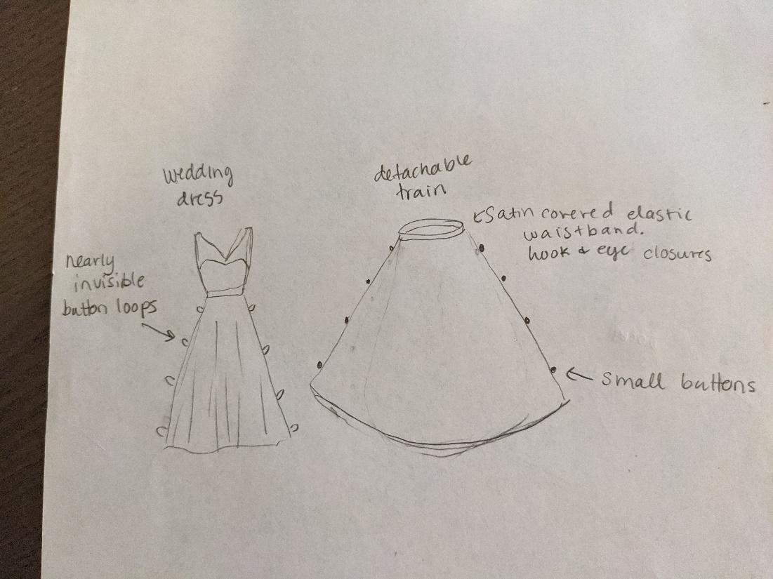 I came up with an idea that I could make the dress without a train, then make a separate train that would attach with an elastic waist band. It would lay on top of my original dress and attach at the sides with buttons and loops. I could use buttons from my mom’s dress and the loops would be nearly invisible when I wasn’t wearing the train. This option was still limited by the amount of fabric I had and the time I had to make this separate piece.Â