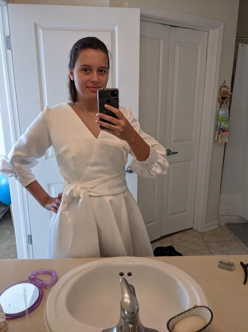 I tried on some dresses at a boutique, but with the timeline I had we were looking at off the shelf dresses with any alterations being made on short notice. I found a couple of dresses I liked, and one even fit me really well without any alterations. I thought about it and for everything I liked about the dress there was always something I wanted to change. I thought the skirt fabric was too light and I was worried it would snag at the reception or wedding which was going to be outdoors. I was also worried I would be cold since we had chosen an October date. That could be fixed if I made an evening jacket to wear over the dress. The skirt could be made sturdier if I made a satin wrap skirt to cover the original one. A different dress I had tried on was almost exactly what I wanted. It was satin and had a beautiful silhouette. It even had pockets, but the proportions it was made for were different than my own and my short waist was causing the bodice boning to dig into my lower back. This was something the dress boutique said would not be able to be fixed in alterations and it was just going to be tight. I thought about my options for a week. The one dress was beautiful, but uncomfortable, and the other dress was comfortable, but my modifications I wanted for it would cover it completely. After thoughtful deliberation I decided to take what I liked from both dresses and make my own version.Â