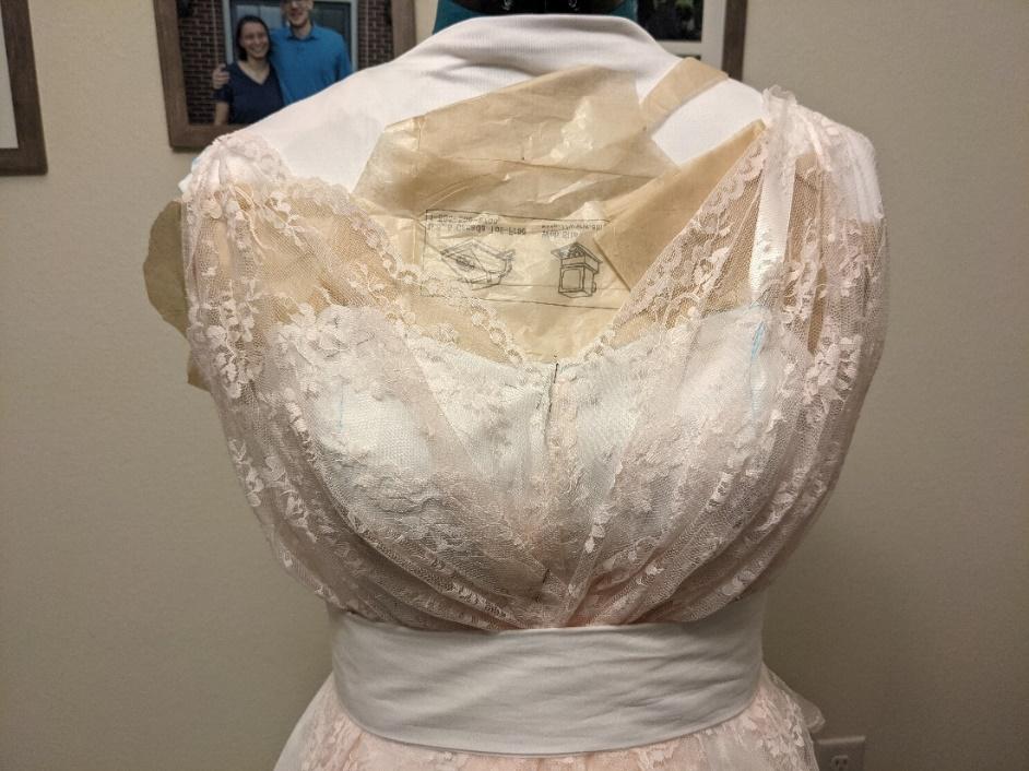 I wanted a sweetheart neckline with a low back in satin and lace draped over top. I started by testing some of the patterns I already owned that matched this style. The first one I tried wasn’t really fitted well to me. I was having a hard time deciding what size each panel should be based on the pattern instructions. The next pattern I tried was a 1950’s vintage blouse. It fit much better, but I did not like the horizontal darts. It looked to casual. It did fit better and gave me some ideas for better fit and draping. I tried draping on my dressform with darts and with panels. I chose the panels since I really liked how it looked finished. I had never draped before, so I had to do a lot of readjusting and trail and error. My dressform was not perfectly accurate so with my skill level I was getting it to fit as close as I could.