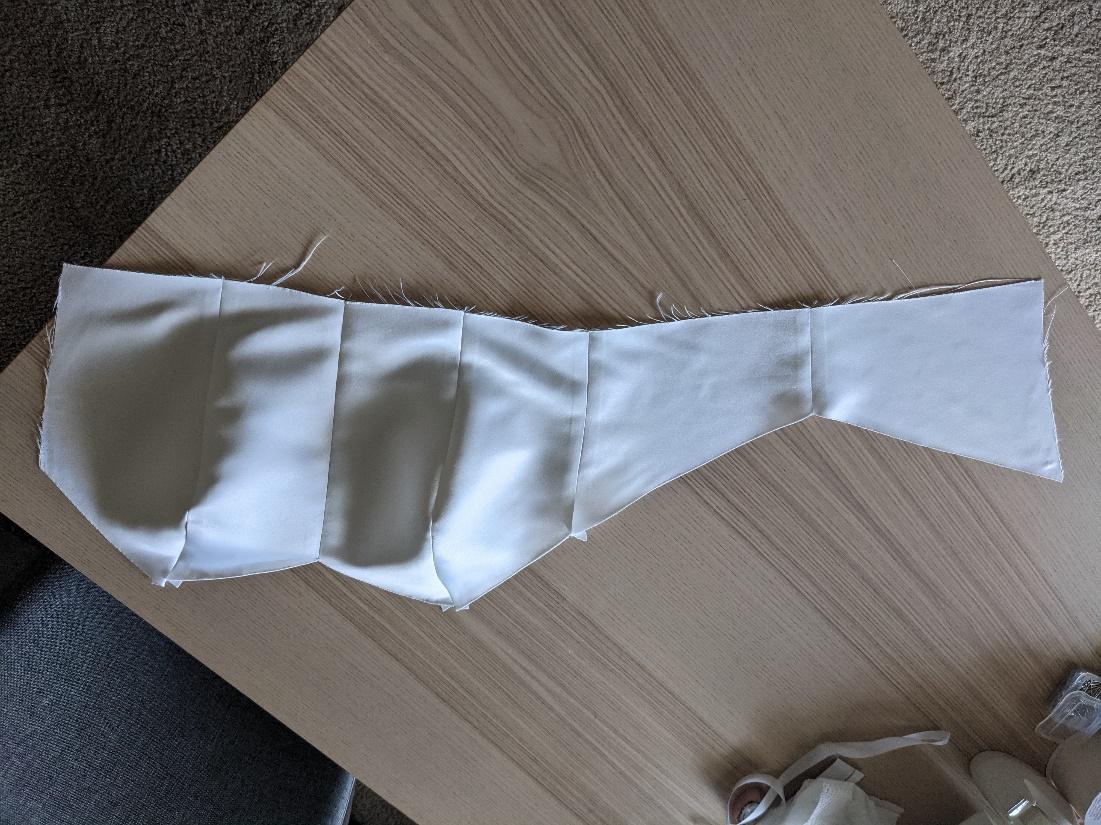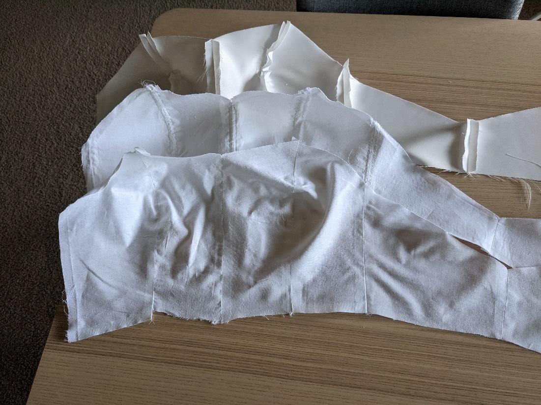 I got my bodice adjusted to how I liked by interfacing some lightweight woven cotton and adding boning channels. Then I made a pattern out of the mockup. I cut my pieces out of my satin and sewed them together.Â