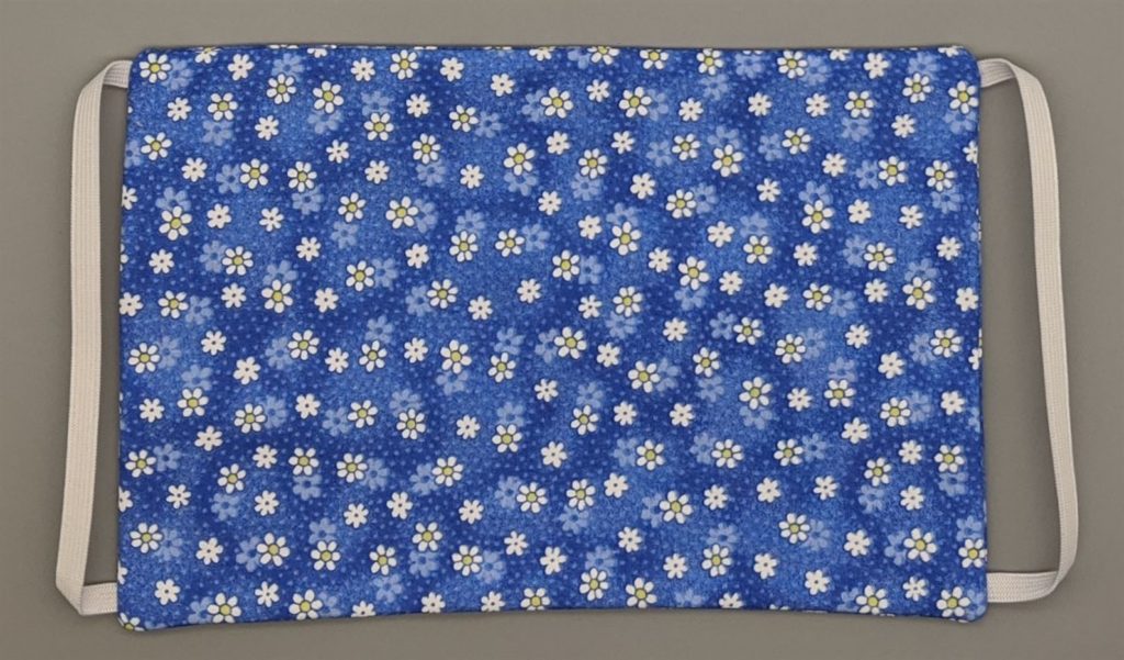 Place one end of the 7″ pieces of elastic in the top right corner of the mask. Pin in place through the quilting cotton and the interlining.