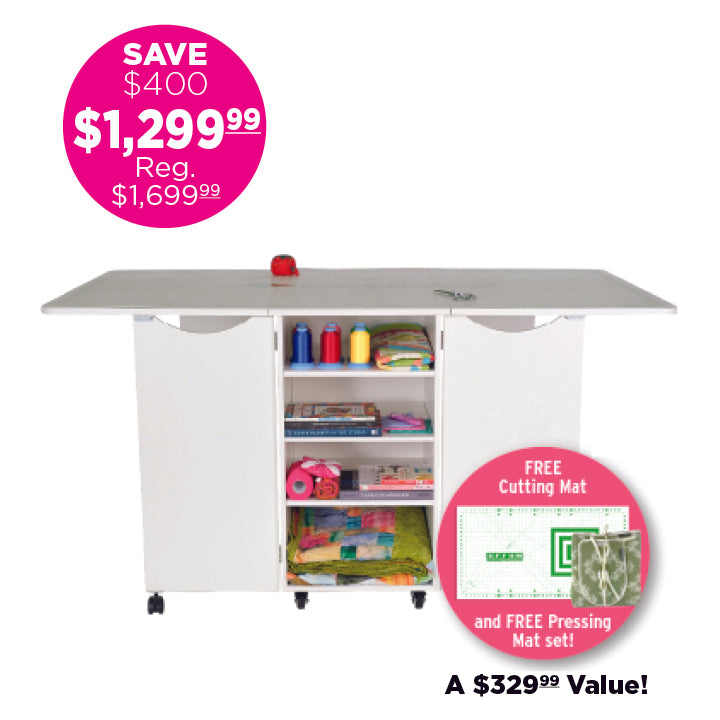Kangaroo’s premiere cutting table, the Kangaroo Kookaburra, is the perfect addition to your sewing and crafting studio! With it’s timeless design and elegant fixtures, the Kookaburra provides storage, convenience and function – along with an expansive 70″ x 40″ work surface!Sitting on 8 heavy-duty casters that provide stability, easy mobility and 360 degree access. Even better – Kookaburra’s 2 side leaves fold down to 20″ x 40″ to easily store when not in use! 4 storage drawers on the front, 4 storage shelves on the back, and 1 beautiful cutting table to help elevate your sewing and crafting experience!