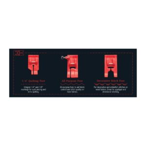 - ¼” Quilting Foot: Integral markings for ¼” and 1/8” precision, ensuring accuracy for quilt piecing and echo quilting.